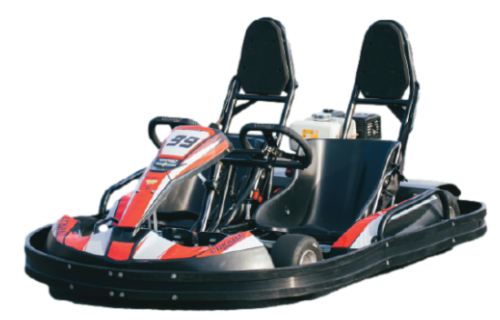 2 gokarty dwuosobowe marki Caroli, idealny do nauki jazdy, a także przewożenia najmłodszych uczestników (od około 100 cm wzrostu). Jeden gokart dwuosobowy jest dostosowany dla osób niepełnosprawnych (sterowanie gazem i hamulcem za pomocą rąk).